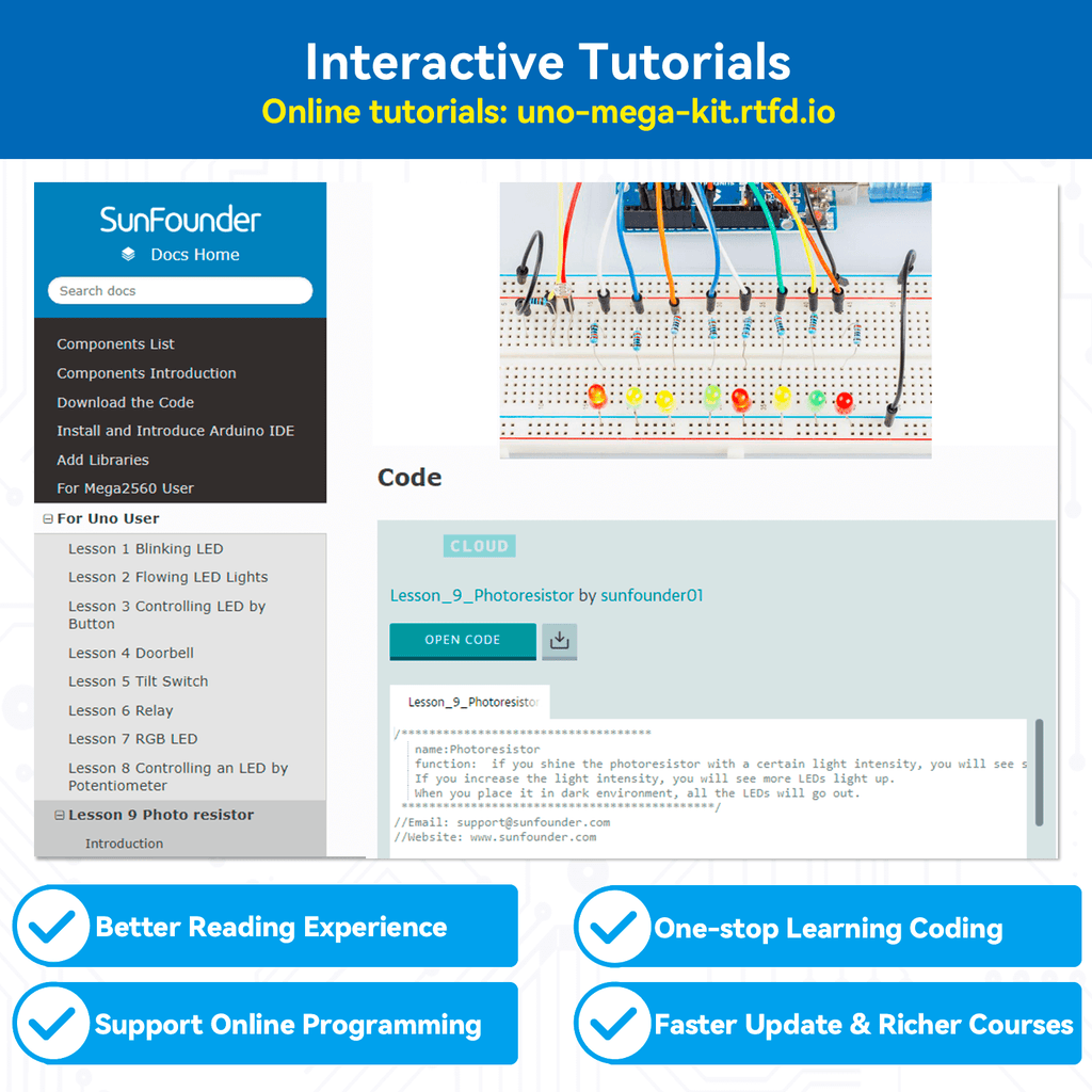 We offer 42 projects for this Starter Kit Compatible with the Arduino Uno R3( 23 Lessons in C Language & 19 Lessons in Scratch), please refer to the Detailed Online Tutorials here: uno-mega-kit.rtfd.io