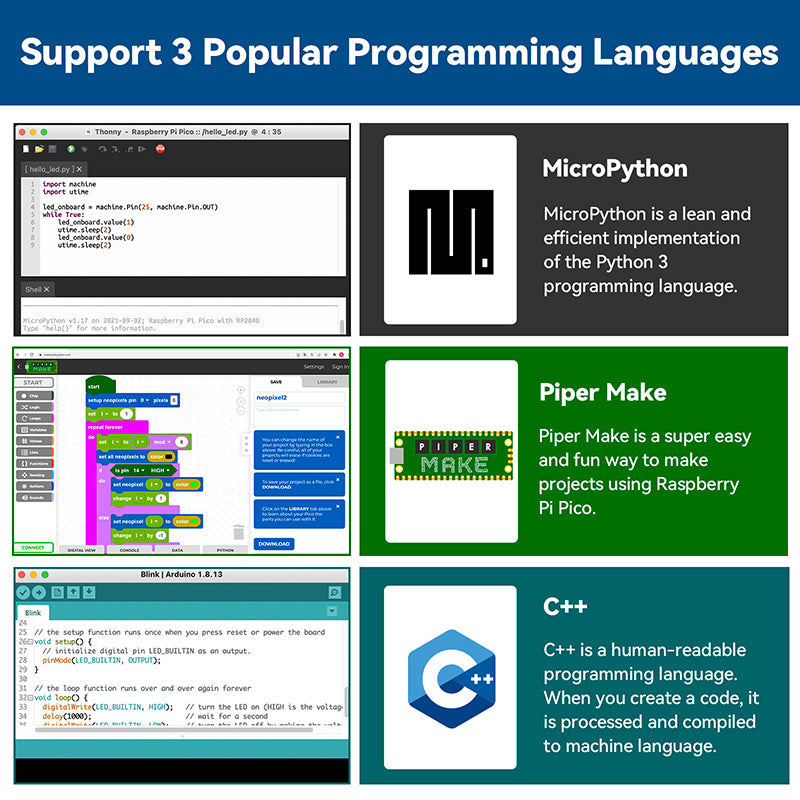• Connect a computer and start writing programs for your Raspberry Pi Pico using the MicroPython / C ++/ Piper Make Language, it's a new world when you code on the Pico, you can do anything you want.