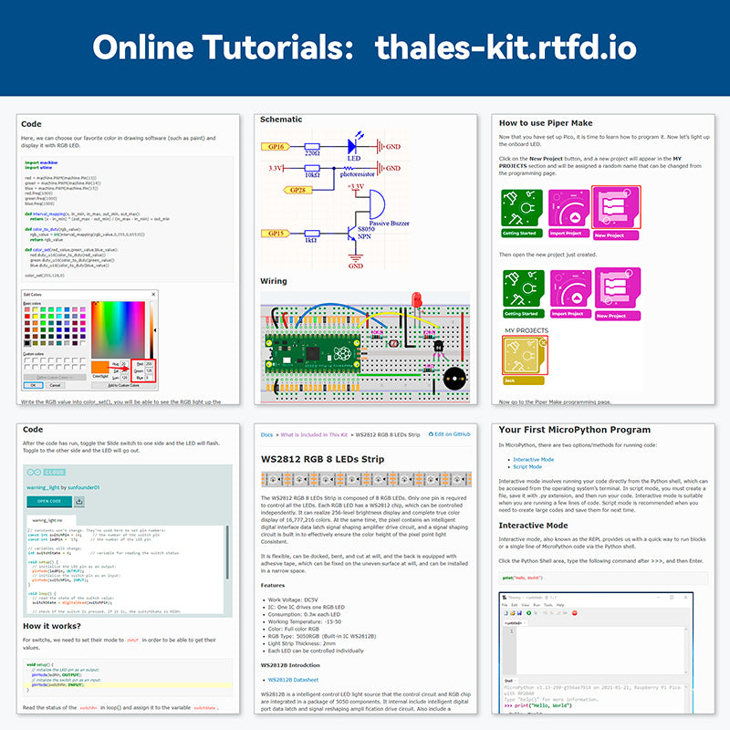 • Using our online tutorial and Pi Pico kit, you can learn electronics and programming in one stop for Raspberry Pi and Arduino beginners and experts. We have prepared many interesting and practical examples for you, and collected a lot of authoritative related information. Online tutorials: thales-kit.rtfd.io