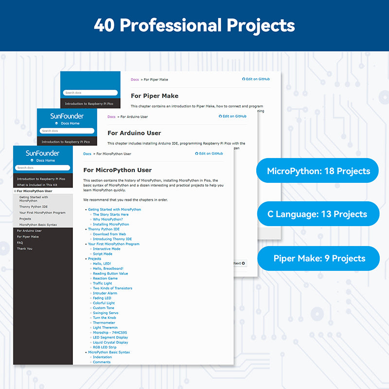 • Thales Kit from SunFounder is a Raspberry Pi Pico Kit with detailed online tutorials. It has 283 items, 40 projects (More projects will be updated soon), each lesson shows a circuit diagram, an overview of the operating principles, and a detailed explanation of the code used for the project to help you learn electronics and application programming.