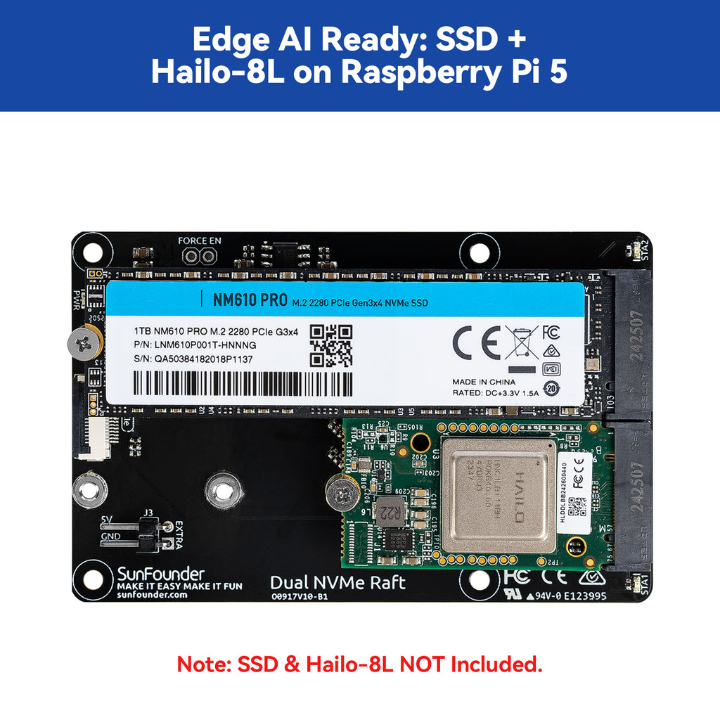SunFounder Dual NVMe Raft for Raspberry Pi 5 PCIe Gen 2.0 to M.2 HAT Key-M SSD Hailo-8L AI Accelerator PIP M.2 2230/2242/2260/2280, NAS RAID 0/1, Manual (Not Compatible with the Pironman Series)